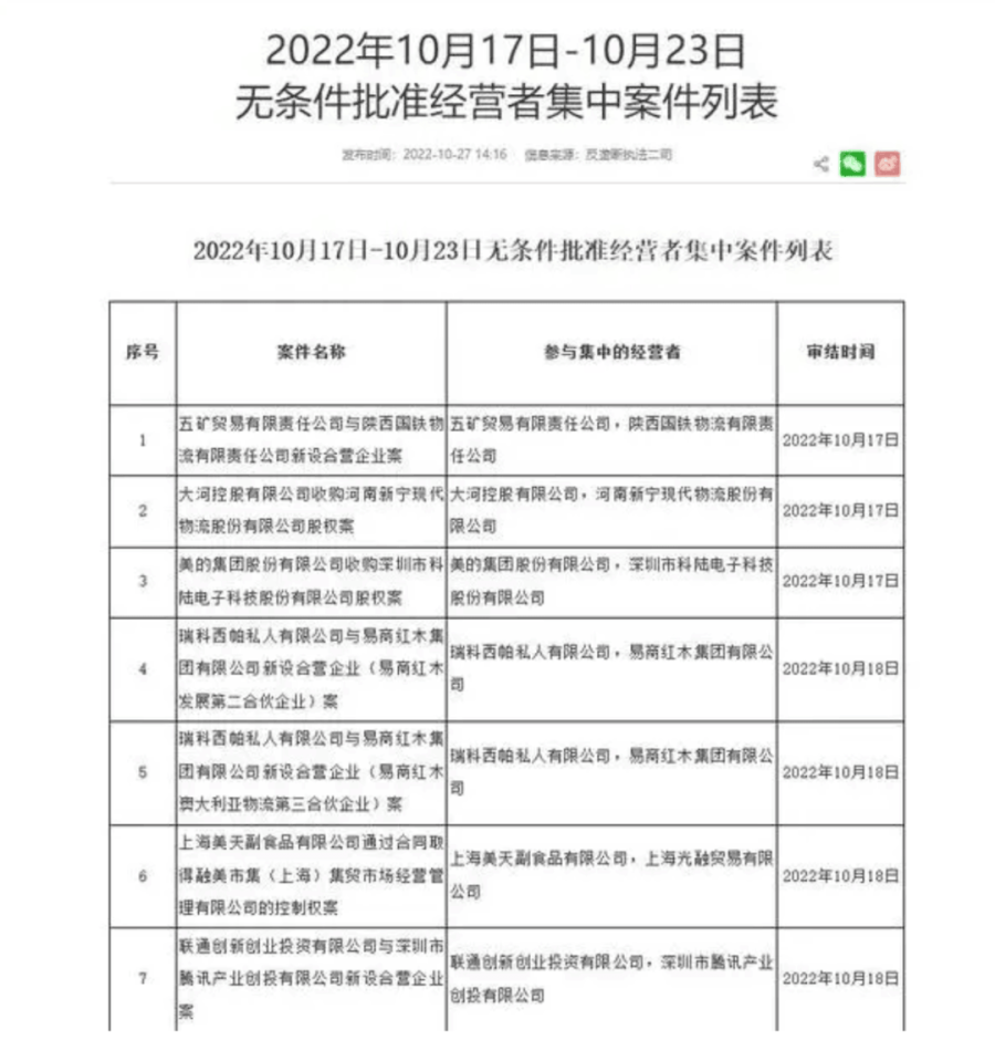 11月2日,记者从国家市场监管总局官网获悉,在10月27日发布的《2022年10月17日-10月23日无条件批准经营者集中案件列表》显示,联通创新创业投资有限公司与深圳市腾讯产业创投有限公司新设合营企业案获无条件批准,审结时间为10月18日。
