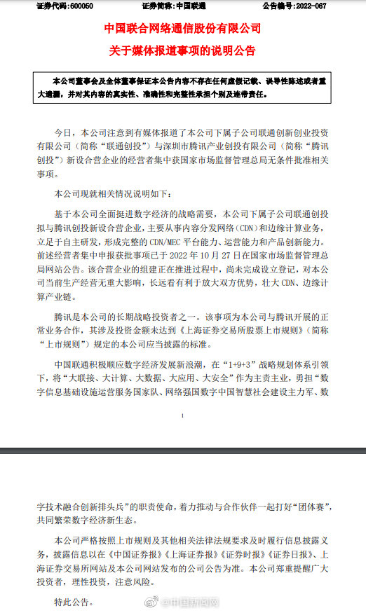 11月2日,联通创投与腾讯创投新设合营企业获批的消息引发关注。当晚,中国联通发布公告回应称,该合营企业的组建正在推进过程中,尚未完成设立登记,对本公司当前生产经营无重大影响,长远看有利于放大双方优势,壮大CDN、边缘计算产业链。