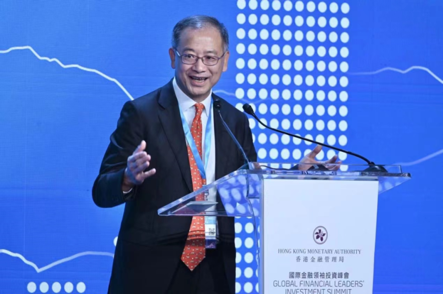 香港特区行政长官李家超在峰会上致辞时表示,香港最坏的情况已经过去了,已看到香港迅速复苏之势,他更形容峰会是“香港重返舞台峰会”,对香港坚韧的实力充满信心。他说,香港在过去数十年间,经历不少跌宕起伏,但香港拥有无比强大的抗逆能力,面对重重难关,香港的金融体系依然强韧稳健,令人称羡。“现在,我们再次打开大门,以喜悦的心情迎接和款待来自世界各地的访客。”李家超在峰会上欢迎海外嘉宾的到来,并称“一国两制”确保香港与内地无缝接轨,为香港提供了其他经济体得不到的优势。“香港仍是世界上唯一一个汇聚全球优势和中国优势的城市。这种独特的融合,让我们成为内地与世界各地之间无可替代的连系平台。”李家超如是强调。他续指,随着世界经济重心东移,内地与区内众多快速增长的经济体势将成为全球经济增长的主要引擎和商机来源。香港具备有利条件,可分享这个不可逆转趋势所带来的庞大利益。香港金融管理局总裁余伟文致欢迎辞。中新社记者 李志华摄