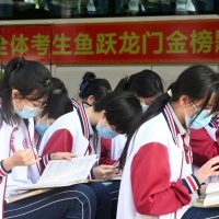 资料图:戴着“高考必胜”口罩的考生正在温习古诗文。中新社记者 翟羽佳 摄