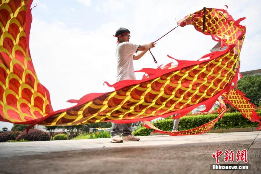 资料图:低年级的学生为考生舞龙加油。 杨华峰 摄