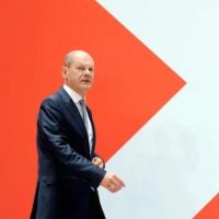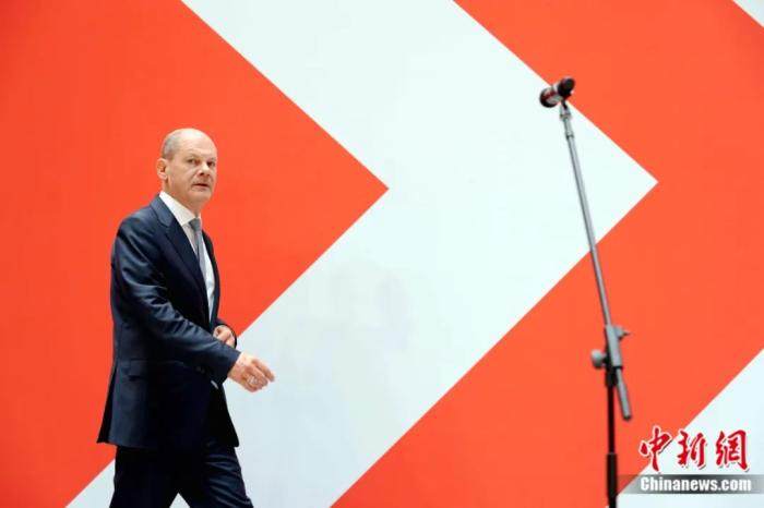 朔尔茨2021年9月27日在柏林社民党总部出席大选后的记者会。彭大伟 摄