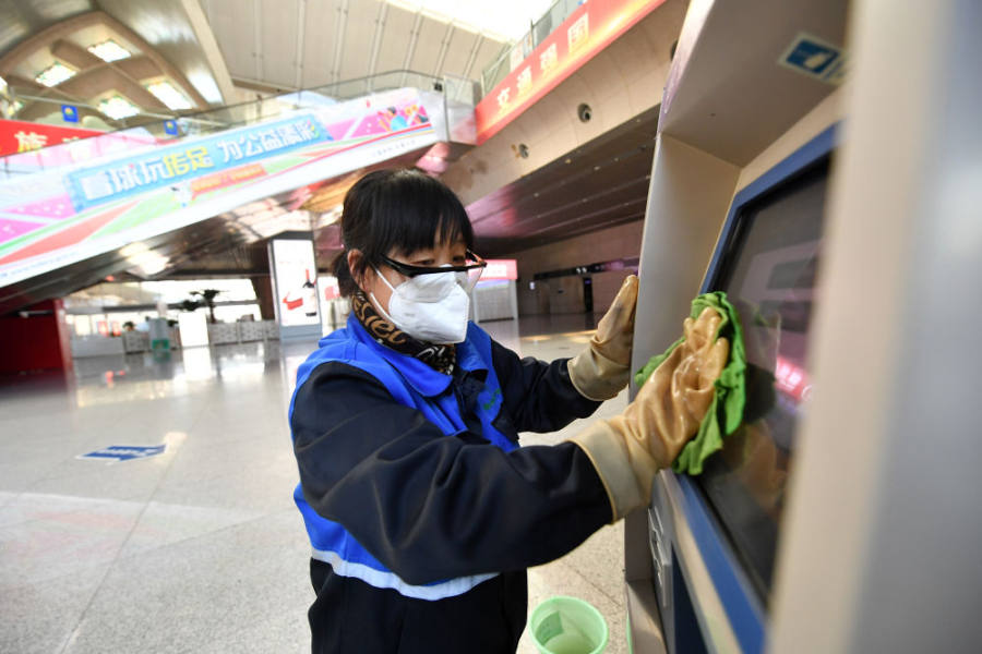 中国铁路兰州局集团有限公司银川车站工作人员在进行清洁作业(10月11日摄)。新华社记者 王鹏 摄