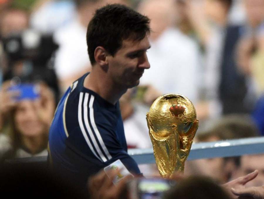 2014年7月13日,阿根廷队球员梅西在巴西世界杯颁奖仪式前从大力神杯前走过。新华社记者吕小炜摄