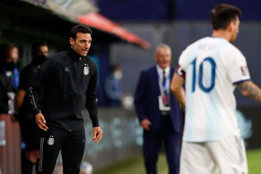 2020年10月8日,阿根廷队主教练斯卡洛尼(左)在世预赛比赛中。新华社/法新