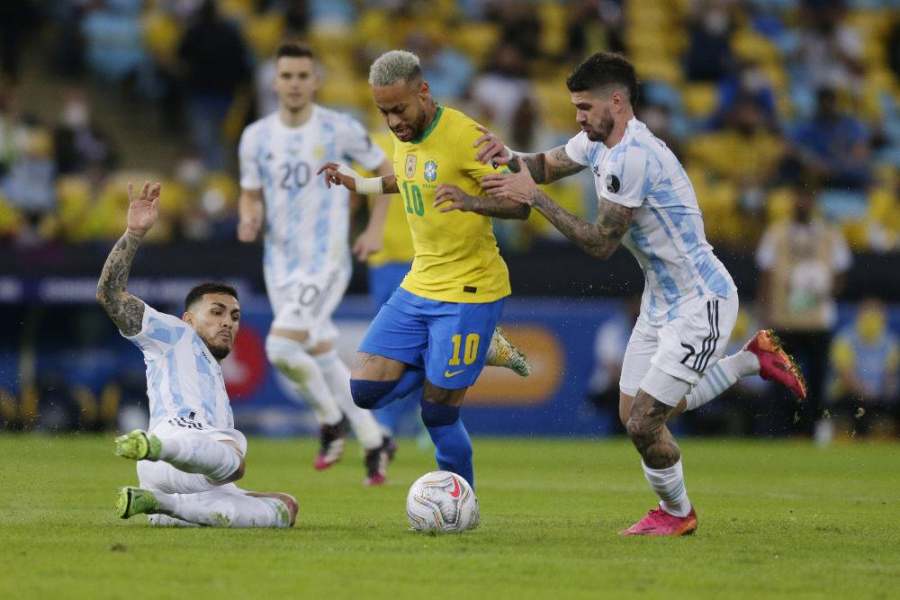 2021年7月10日,巴西队球员内马尔(右二)与阿根廷队球员德保罗(右一)在美洲杯决赛中拼抢。新华社发(卢西奥·塔沃拉摄)