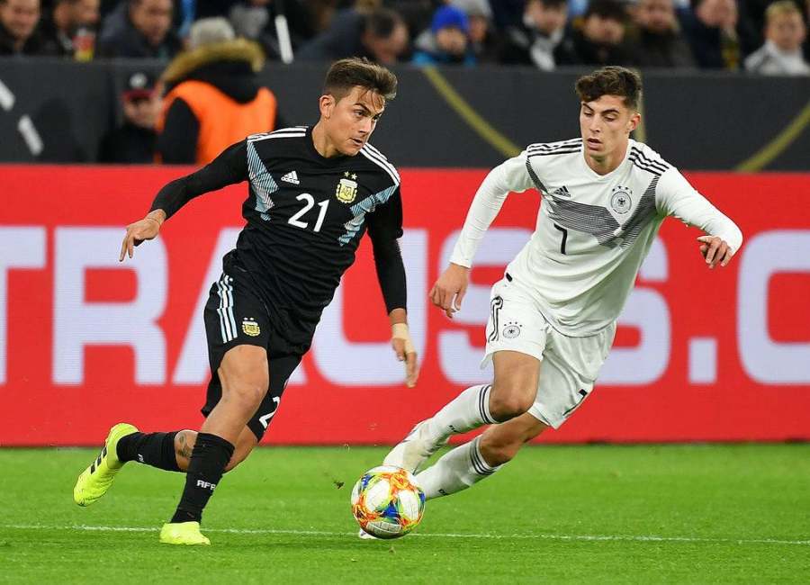 2019年10月9日,德国队球员哈弗茨(右)在友谊赛中与阿根廷球员迪巴拉拼抢。新华社发(乌尔里希·胡夫纳格尔摄)