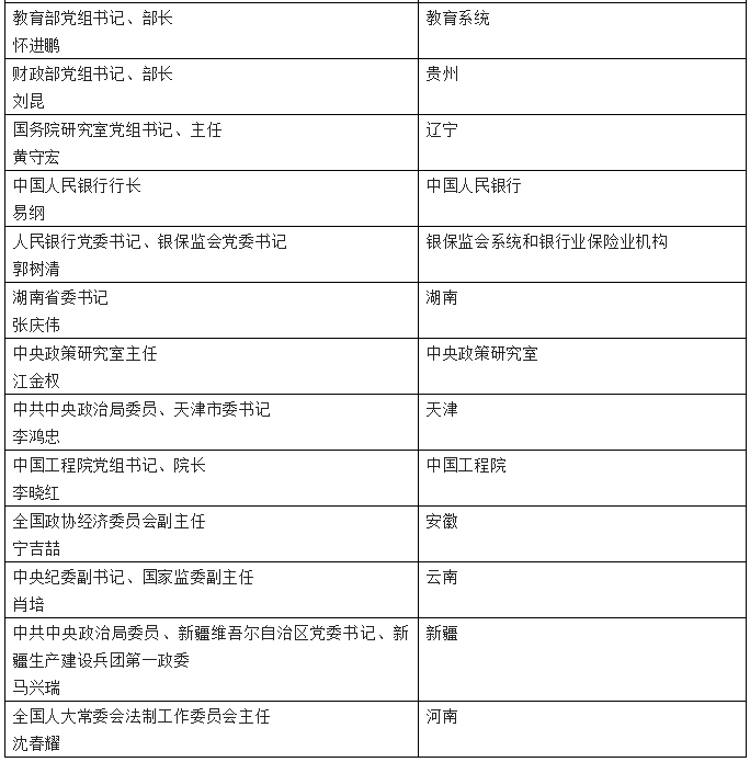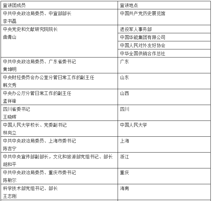 据记者不完全统计,按出现在公开报道中的时间,目前披露的中央宣讲团成员有: