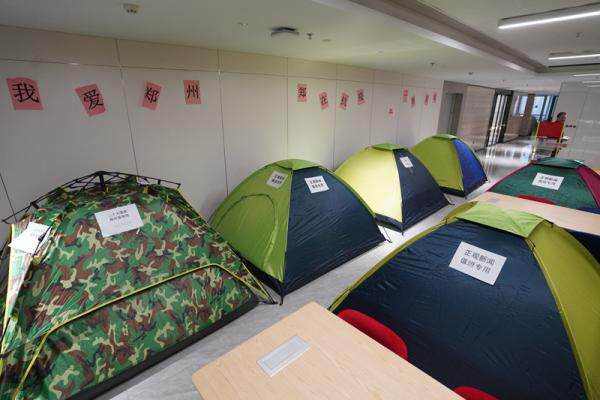 郑州日报、郑州晚报、中原网、正观新闻等各单位中层和骨干人员来到报社,24小时随时在线,困了,就在采编大厅里住帐篷、睡沙发、躺行军床;