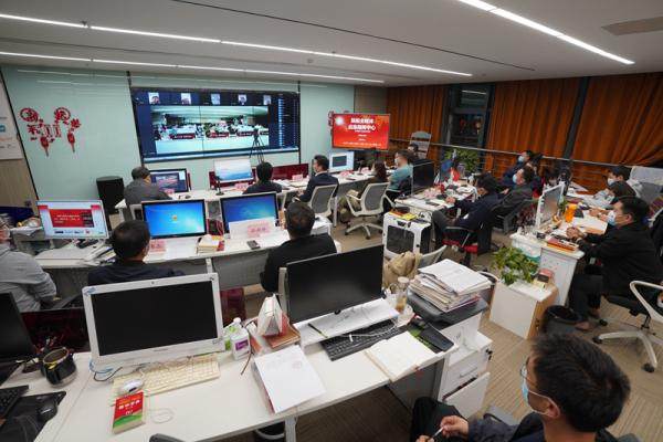 调度会以线上线下共同参与的形式举行:日夜值守在郑报大厦的社长、总编、副总编和郑州日报、郑州晚报、中原网、正观新闻等媒体负责同志、骨干采编人员120多人在指挥大厅现场参会,封闭在家的郑报集团各部门负责人、采编部门主任、骨千采编人员以视频形式参会。