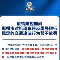 为保障当前广大市民复工复产的出行需求,经郑州市政府同意,在疫情防控期间,郑州市全域内对违反机动车尾号限行规定的交通违法行为暂不处罚,何时恢复常态化管理措施另行发布。