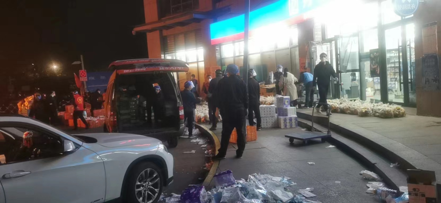6日凌晨志愿者们搬运物资场景