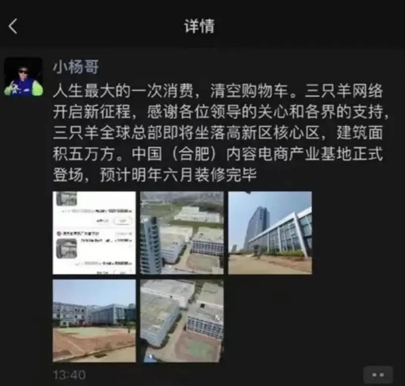 据了解,“疯狂小杨哥”之前在社交平台更新了一则动态,称自己花了一亿多元人民币在合肥购置了一处房产,用来当做合肥三只羊网络科技有限公司的全球总部。
