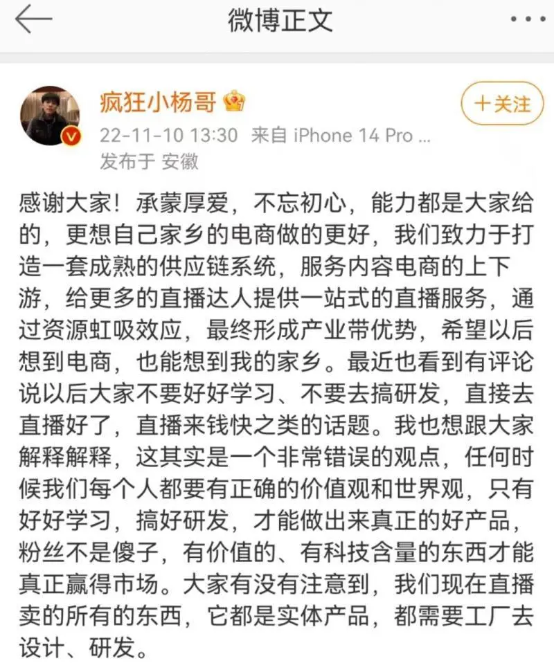10日中午,“疯狂小杨哥”也更新了微博,文中称,能力都是大家给的,更想自己家乡的电商做的更好,正致力于打造一套成熟的供应链系统,服务内容电商的上下游,给更多的直播达人提供一站式的直播服务,通过资源虹吸效应,最终形成产业带优势,“希望以后想到电商,也能想到我的家乡”。