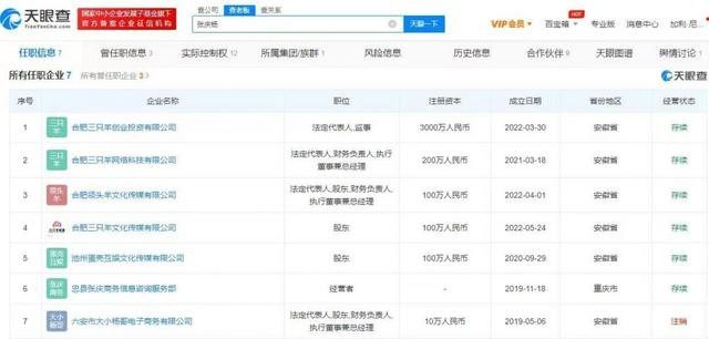 天眼查App显示,疯狂小杨哥张庆杨目前关联企业共7家,存续状态的有6家。其中,张庆杨在合肥三只羊创业投资有限公司、合肥三只羊网络科技有限公司、合肥领头羊文化传媒有限公司中担任法定代表人、执行董事、财务负责人等职位,同时担任合肥领头羊文化传媒有限公司、合肥三只羊文化传媒有限公司、池州蛋壳互娱文化传媒有限公司的股东,此外,他还是忠县张庆商务信息咨询服务部的经营者。
