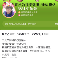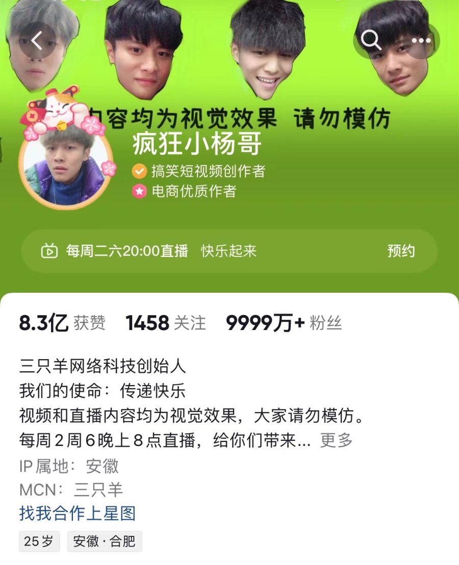 提起“疯狂小杨哥”,大家应该都不陌生,抖音头部短视频创作达人,2015正式开始短视频创作,凭借着创作喜剧短视频内容获得大家喜爱。目前,抖音账号“疯狂小杨哥”的实际粉丝数量已经突破1亿,成为抖音首个粉丝过亿的达人主播。此前,抖音并无粉丝破亿的个人账号,机构账号中人民日报和央视新闻分别达到1.6亿和1.5亿的粉丝量。