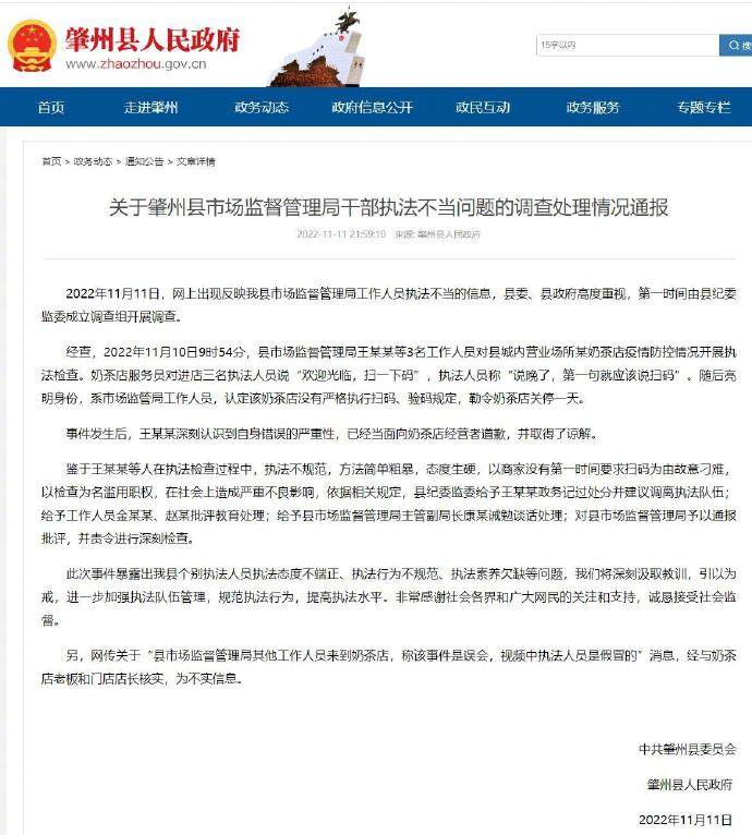 官方通报“奶茶店未先说扫码被勒令关门”:多人被处理