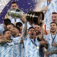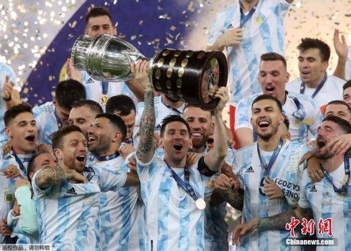 在巴西进行的2021年美洲杯决赛中,凭借迪玛利亚的进球,阿根廷队1:0战胜巴西队获得冠军。在经历一次次挫折后,梅西终于捧得了他在成年国家队的首个杯赛冠军。图为梅西捧起冠军奖杯。