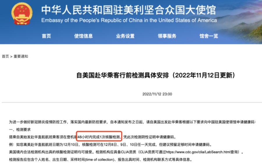今天,中国驻新加坡,加拿大,美国等多国大使馆发布通知称,调整了赴华人员行前检测的政策,要求乘坐赴华航班人员在登机前需在48小时内进行1次核酸检测,凭阴性证明即可申请健康码。