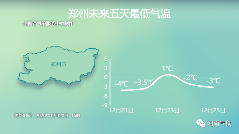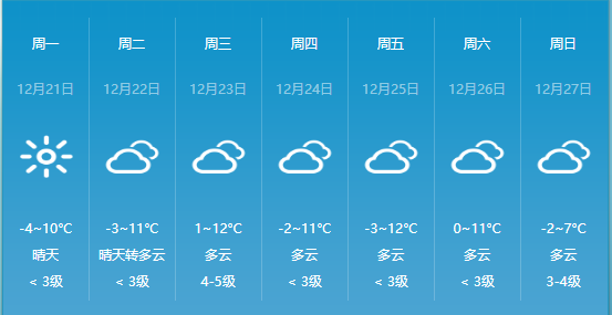 郑州市本周七天具体天气预报情况为:12月21日(星期一):晴天间多云,-4~10℃;12月22日(星期二):晴天到多云,-3~11℃;12月23日(星期三):多云转晴天,西北风4级,1~12℃;12月24日(星期四):晴天间多云,-2~11℃;12月25日(星期五):晴天转多云,-3~12℃;12月26日(星期六):多云间阴天,0~11℃;12月27日(星期日):多云间晴天,-2~7℃。