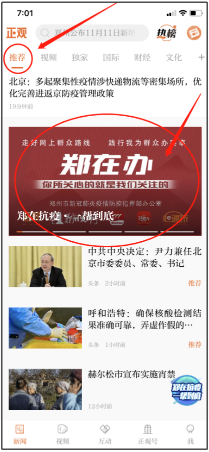 2、进入APP后,在推荐频道下划找到“郑在办”焦点图,点击进入;