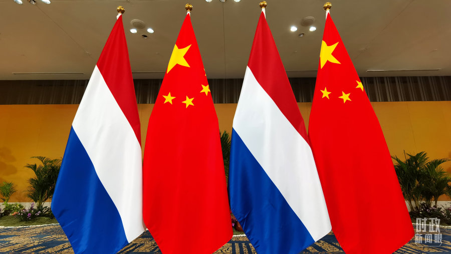 △会见现场的中国和荷兰两国国旗。
