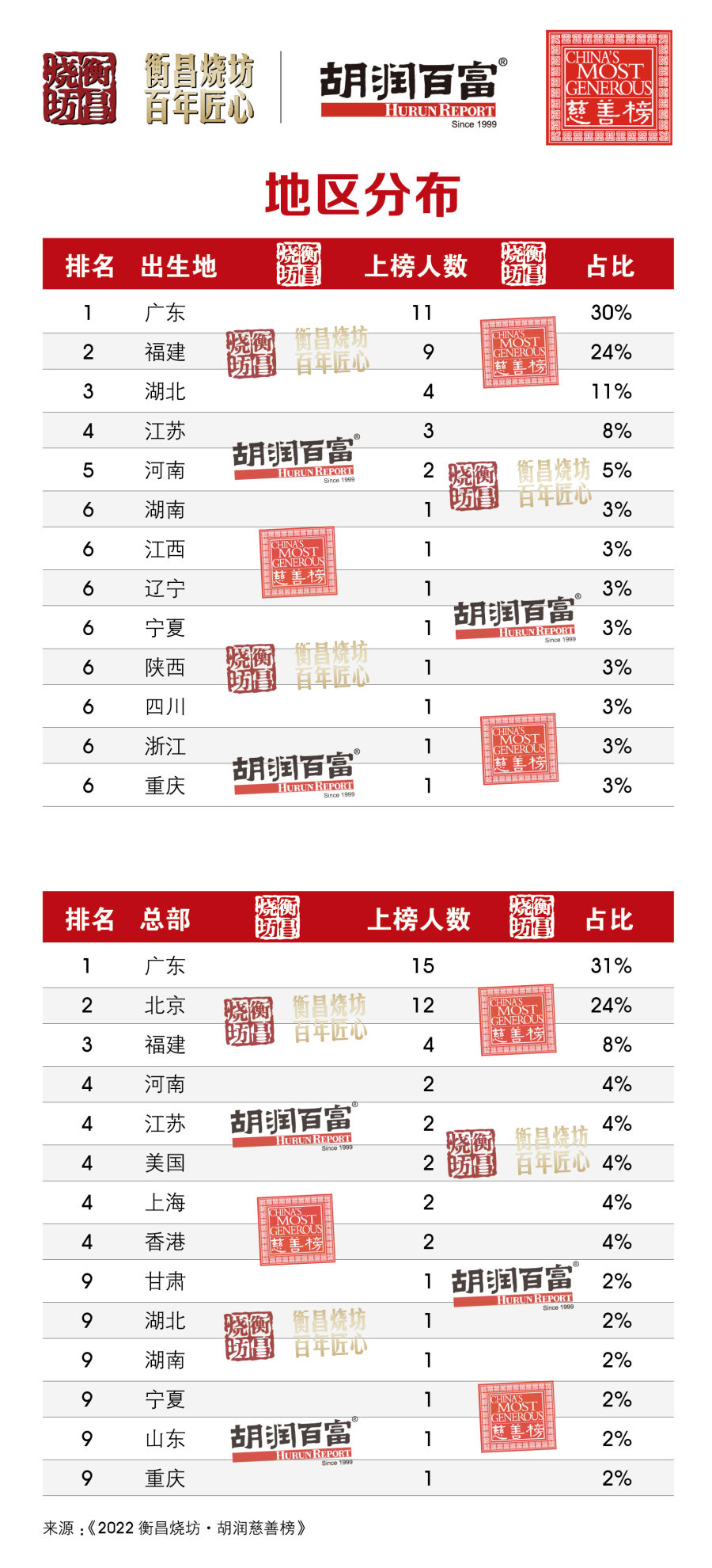胡润表示,从出生地来看,粤商仍然最多,占比30%,比去年多3%;闽商仍然第二,占比24%,比去年多5%。
