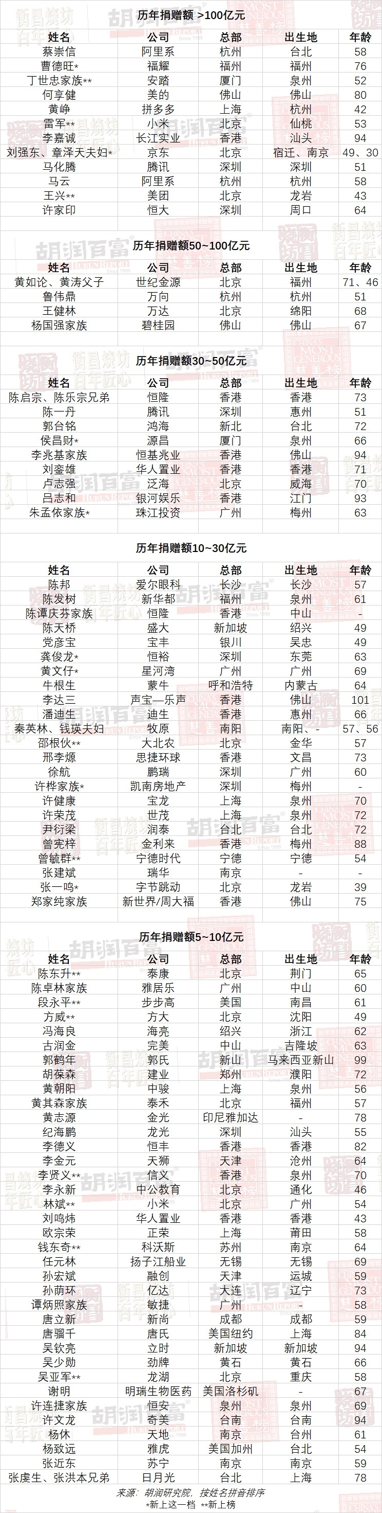 据胡润统计,前十位上榜慈善家均位列今年胡润百富榜,捐赠额占他们总财富的6.3%。