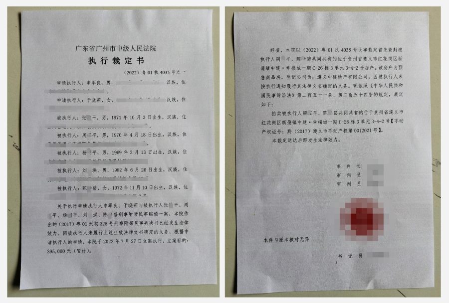 《执行裁定书》显示,广州中院作出的(2017)粤01刑初328号刑事附带民事判决书已发生法律效力,但由于张某平、周某平等5名被执行人未能履行该判决书确定的义务,根据申请执行人(申军良夫妇)的申请,广州中院于2022年7月27日立案执行,立案标的为39.5万元。