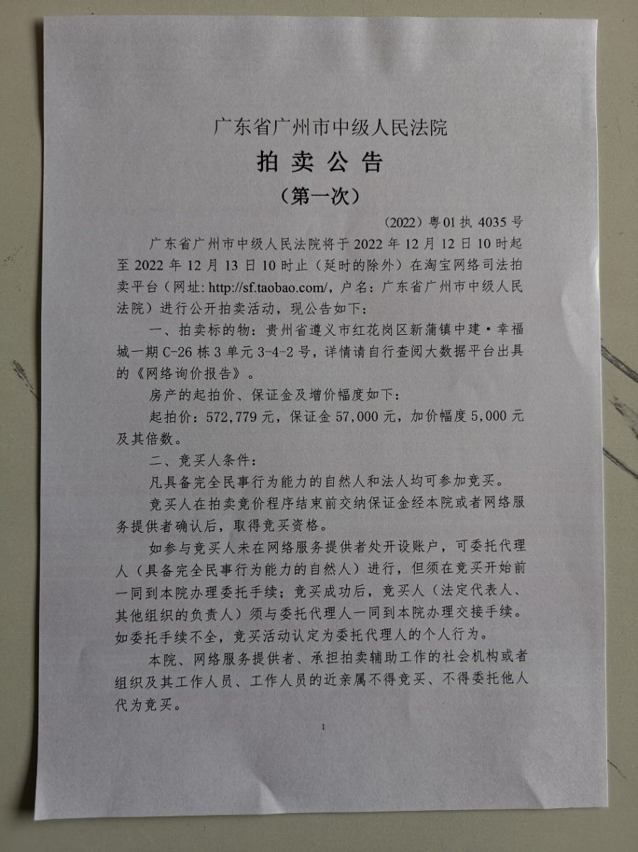 经法院核查,人贩周某平、陈某碧在贵州省遵义市红花岗区共有一处房产,因两人未按执行通知履行法定义务,广州中院依照《中华人民共和国民事诉讼法》第二百五十一条、第二百五十四条作出裁定:拍卖周某平、陈某碧共有的位于贵州省遵义市红花岗区的房产,其中部分用于赔偿申军良夫妇的39.5万元物质损失。据拍卖公告显示,广州中院将于2022年12月12日在淘宝网络司法拍卖平台对此房产进行公开拍卖。