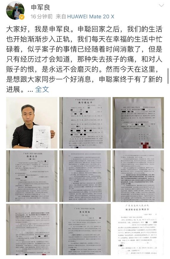 如今,这份《执行裁定书》的生效,也标志着“梅姨案”中“申聪被拐案”刑事附带民事诉讼赔偿的执行得到了法律保障。11月16日中午,申军良发布长文,表达了对广东高院、广州中院以及社会爱心人士的感谢,并表示:“虽然民事赔偿金额弥补不了人贩子对我们家15年间所造成的伤害,但是作为打拐案件判决中的标杆案件,从最初的公安部督办,到后来的广东省高院终审支持民事赔偿,再到现在的广州市中院执行法拍,都展现了国家各级有关部门对我们案件的重视与推进,让我们感受到了国家对于打击拐卖妇女儿童案件的决心。”
