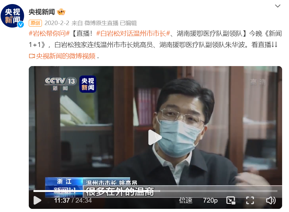 据媒体报道,当时在栏目中,姚高员回应了诸如“温州新增确诊病例为什么多?”“防控疫情,温州眼下最急的是什么?”等一系列问题。他还提供了不少具体数据,比如,“温州在武汉的温商约18万人。通过投资促进局、温州商会劝说在武汉的温商叫他们近期不要回温州。动员之后,从武汉回来的温商,18万当中只回来2万人左右。”节目播出不久,#白岩松对话温州市市长#的话题登上微博热搜,短时内阅读量过亿、点赞超300万,有网友留言“温州市长发言太圈粉,条理清晰,数据明确,态度诚恳。”