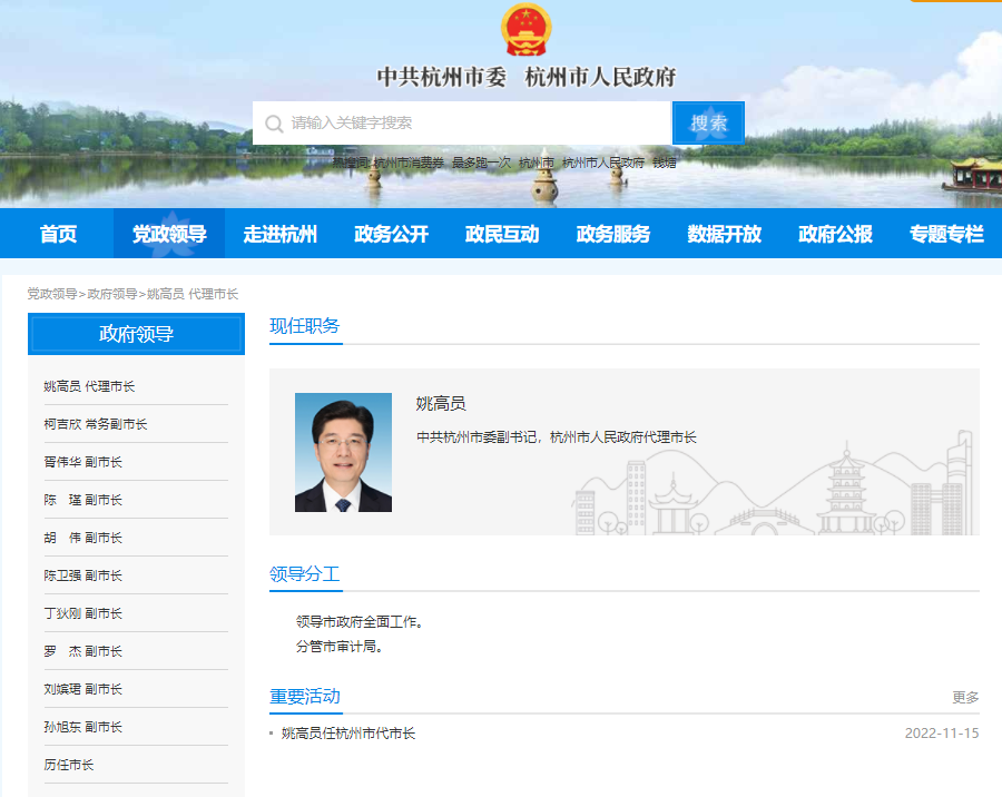 杭州市人民政府官方网站显示,姚高员目前同时担任中共杭州市委副书记,杭州市人民政府代理市长。领导市政府全面工作,分管市审计局。