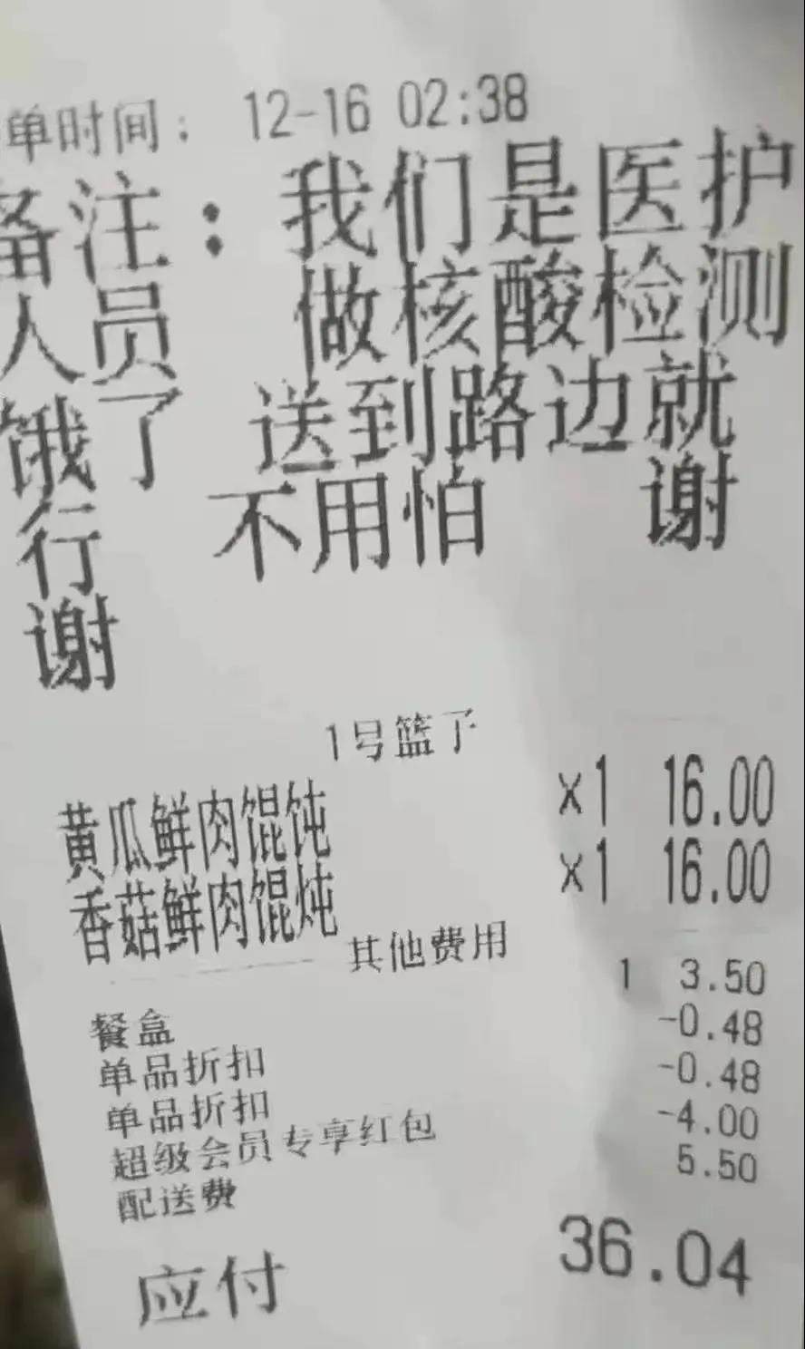 令人骄傲的是,类似的体贴和关怀并非个例。16日凌晨,在寒冷的大连,一张外卖订单上的一句话“火了”:“我们是医护人员,做核酸检测饿了,送到路边就行,不用怕,谢谢!”订单留言时间是凌晨2时许,而医护人员所订的外卖只是两碗馄饨。一样的艰辛,一样的柔软,一样的亲情式提示,在他们饥饿的肺腑中,分明闪现着对世间忧患的关切之意。