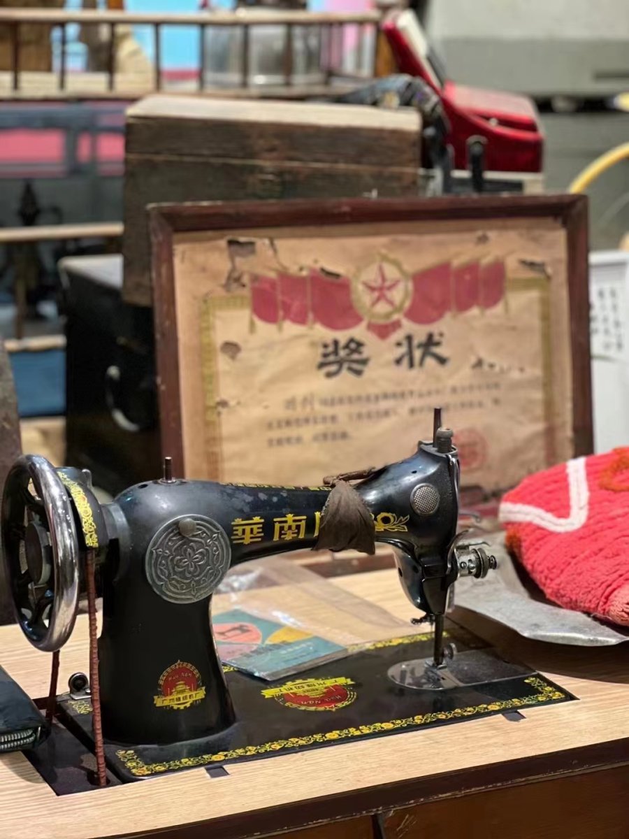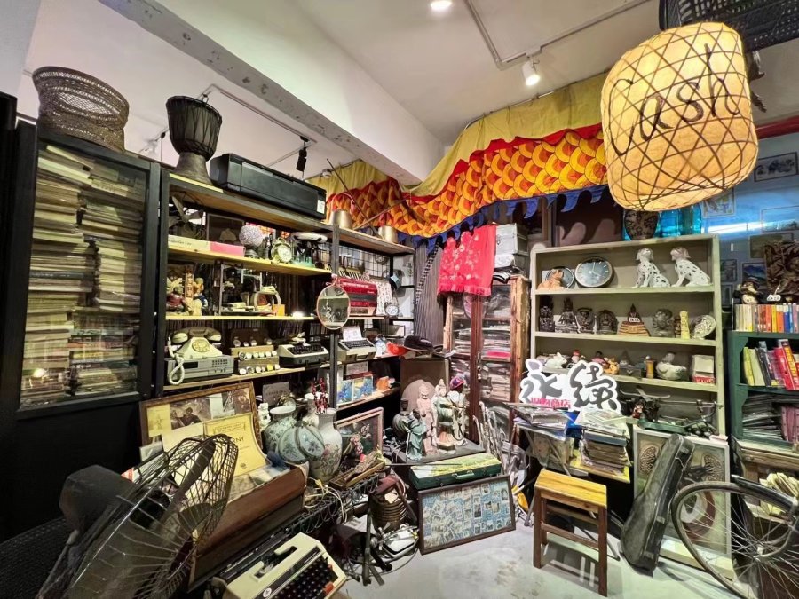 这家小店就坐落在这样一片闹市中,它奇妙地在墙上打了个洞,一墙之隔不同的光景就这样连了起来,如果说隔壁的寻日无限是代表着当年的港风光景,永续旧物则更偏向内地的旧日生活,店铺里满满当当,衣车、挂钟、杂志,件件带着亲切感。