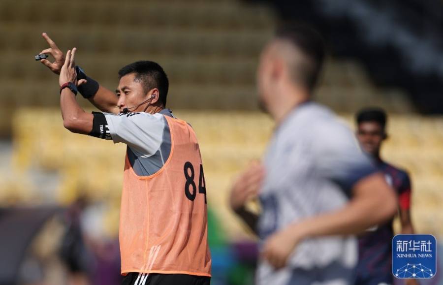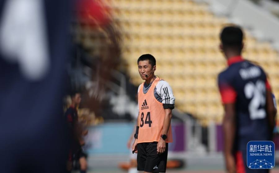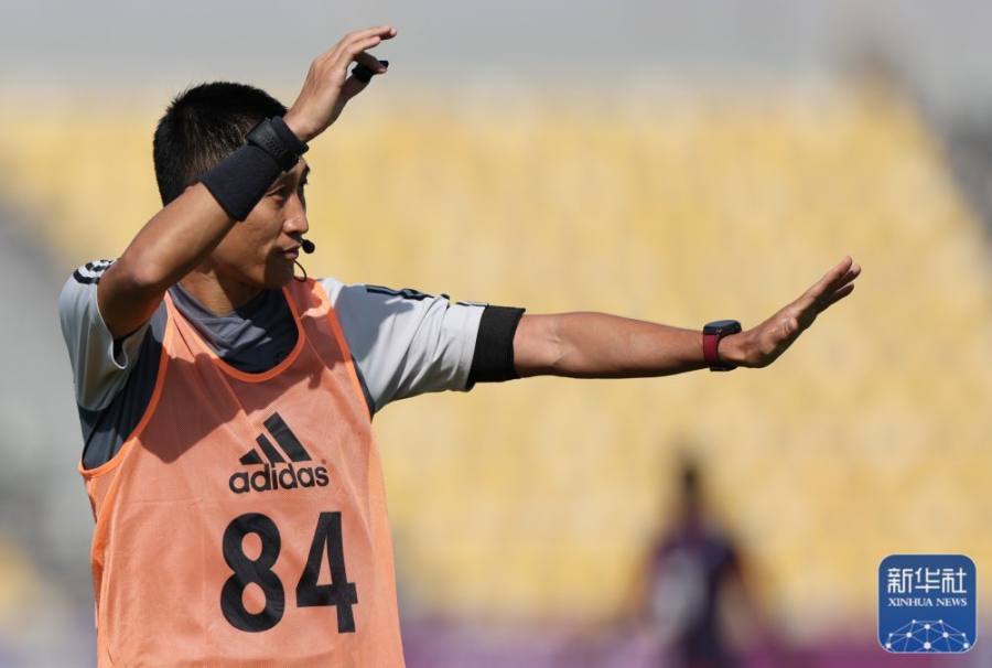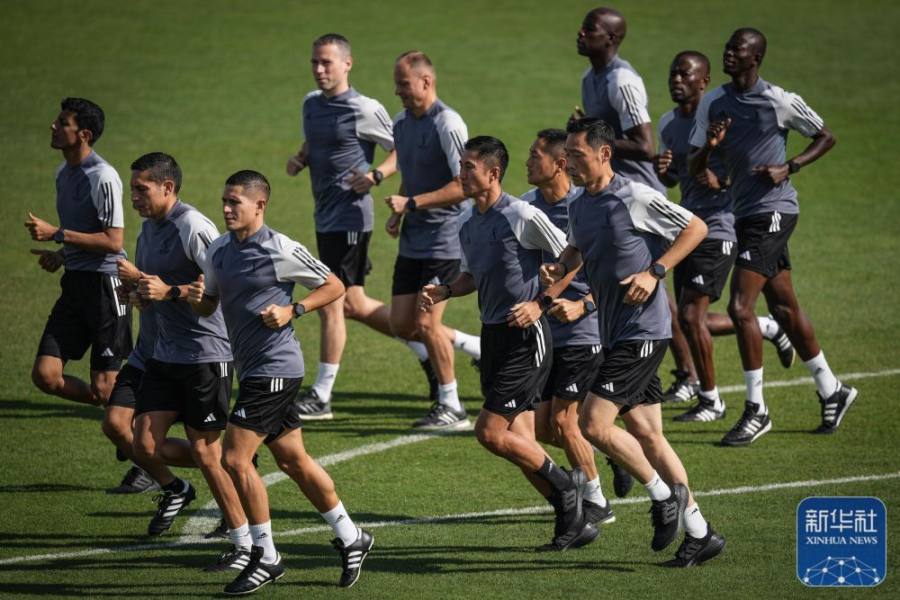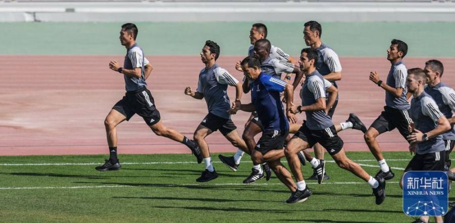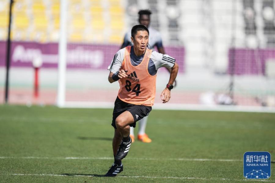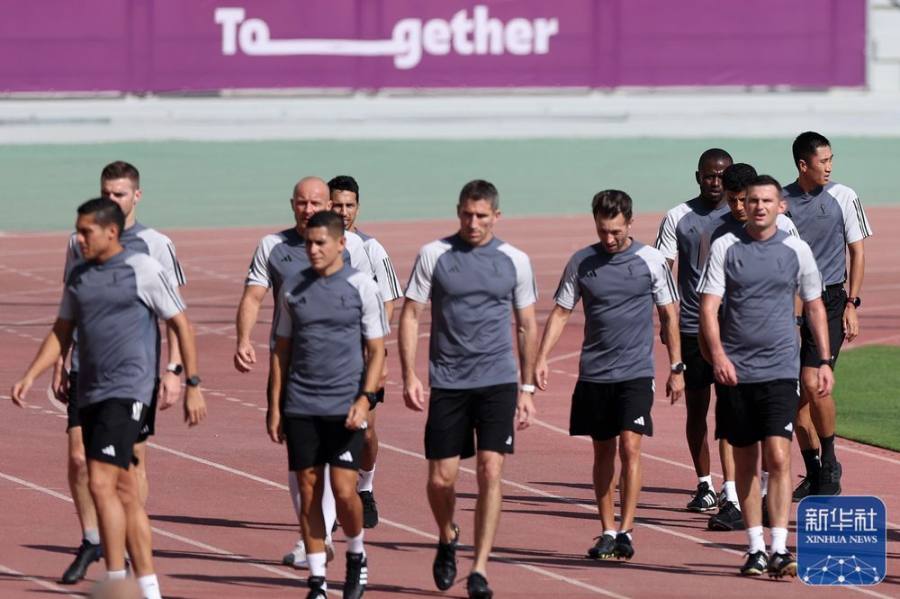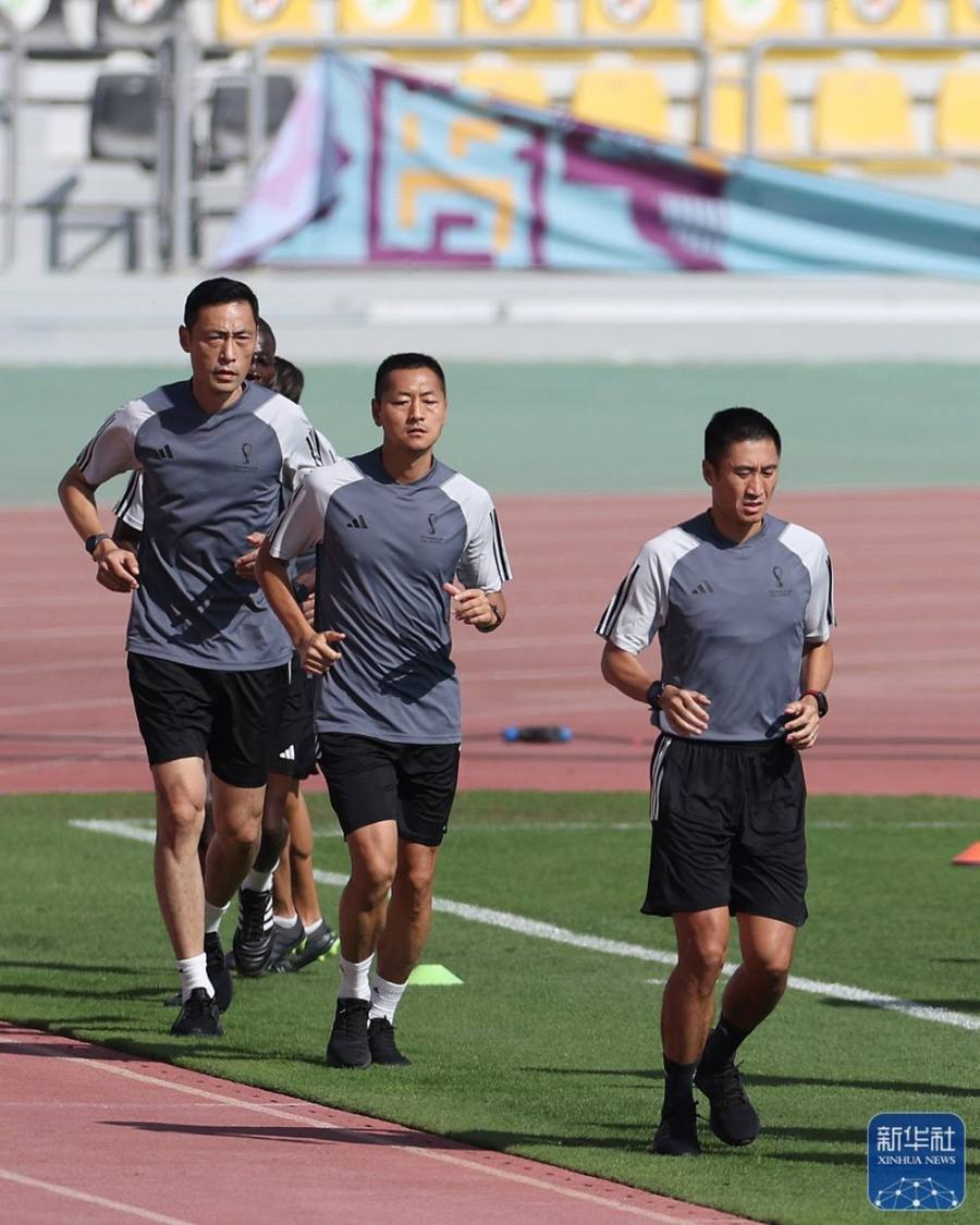 当地时间11月18日,入选2022年卡塔尔世界杯裁判员名单的中国裁判马宁、曹奕与施翔在卡塔尔体育俱乐部球场进行训练。