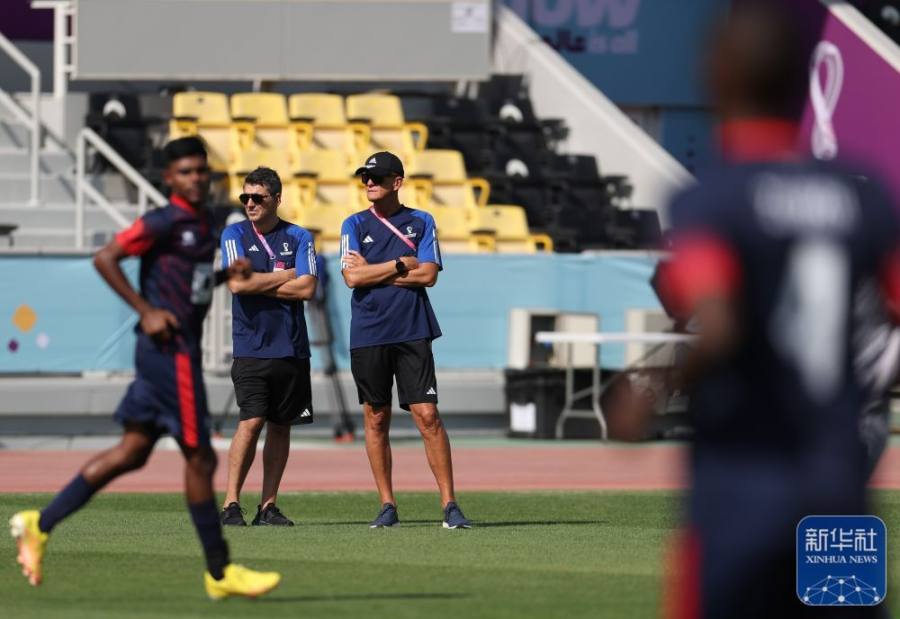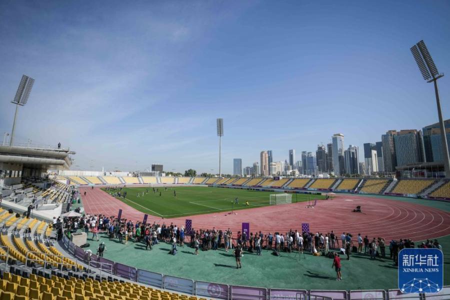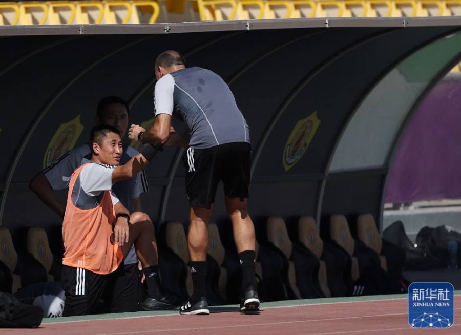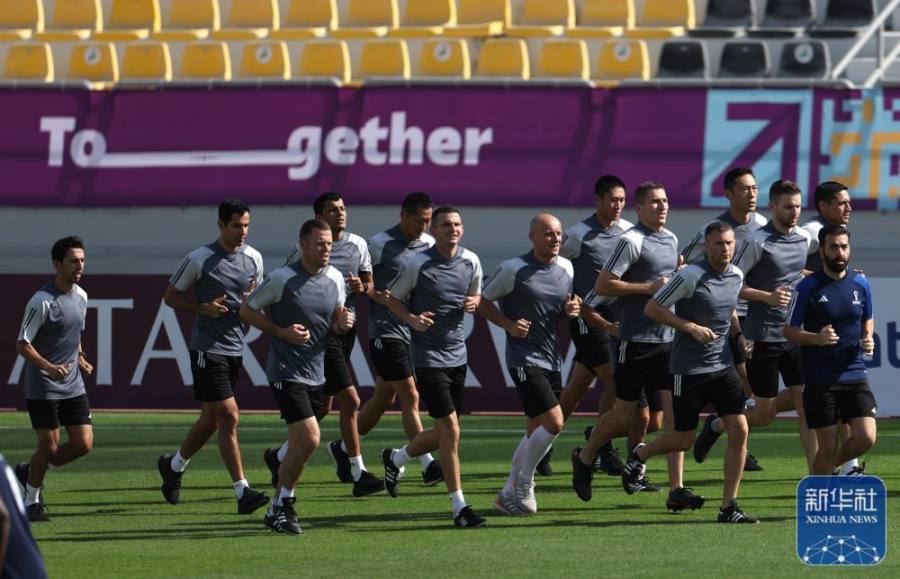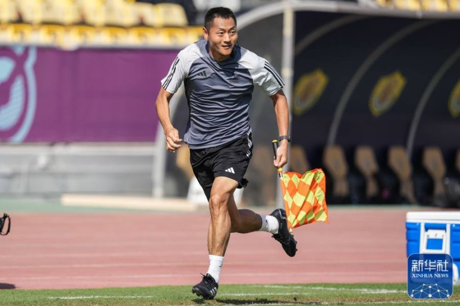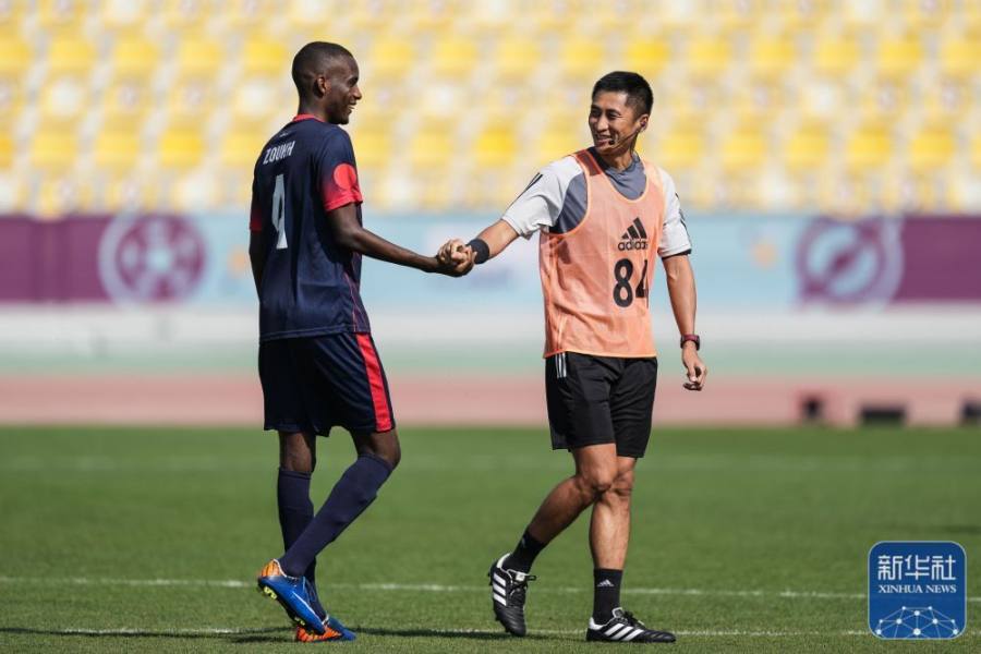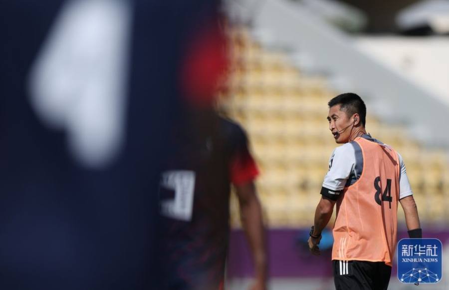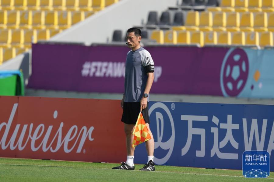 当地时间11月18日,入选2022年卡塔尔世界杯裁判员名单的中国裁判马宁、曹奕与施翔在卡塔尔体育俱乐部球场进行训练。