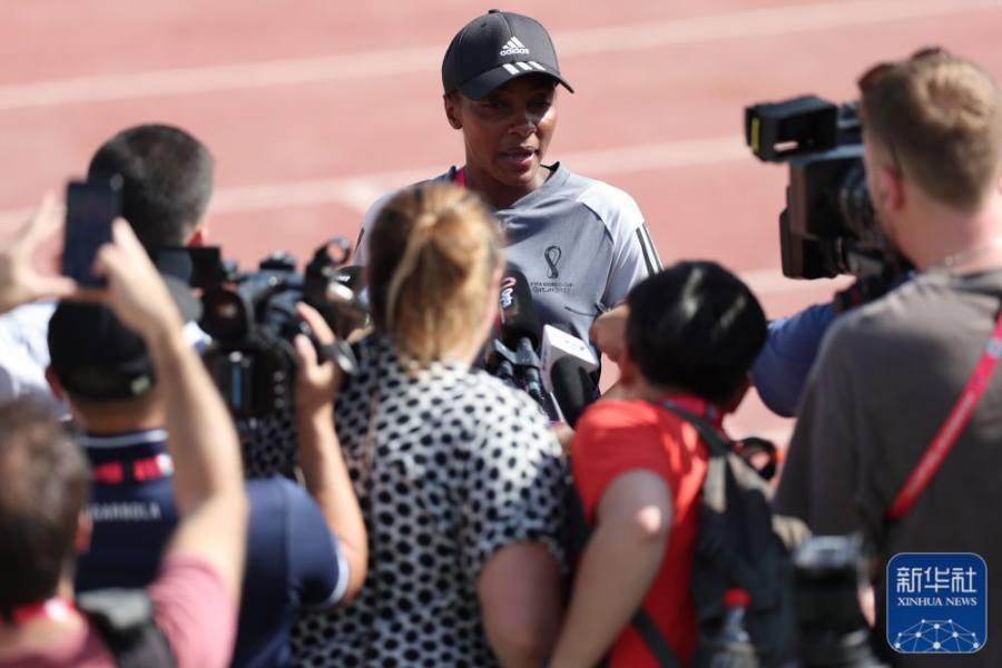 ↑卢旺达女主裁穆坎桑加(后)在训练前接受采访,本届世界杯将首次出现由女主裁执法比赛