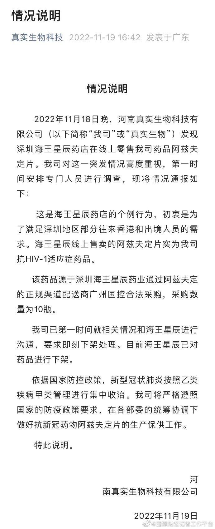 据河南真实生物科技通报:2022年11月18日晚,河南真实生物科技有限公司发现深圳海王星辰药店在线上零售我司药品阿兹夫定片。经调查,这是海王星辰药店的个例行为,初衷是为了满足深圳地区部分往来香港和出境人员的需求。海王星辰线上售卖的阿兹夫定片实为我司抗HIV-1适应症药品。该药品源于深圳海王星辰药业通过阿兹夫定的正规渠道配送商广州国控合法采购,采购数量为10瓶。我司已第一时间就相关情况和海王星辰进行沟通,要求即刻下架处理。目前海王星辰已对药品进行下架。