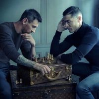 图片中,C罗和梅西在LV的箱包上下着国际象棋。