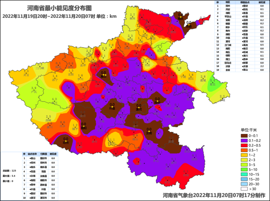 19日20时至20日7时,我省大部县市出现能见度小于200米的强浓雾,濮阳、郑州、平顶山、漯河、南阳、周口、驻马店等地部分县市出现能见度50米以下的特强浓雾。今天上午,全省大部地区雾仍然持续。