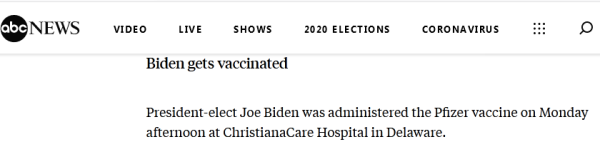 美国广播公司(ABC)消息,当地时间周一(21日)下午,美国当选总统拜登在位于特拉华州的克里斯蒂安娜医院(ChristianaCare Hospital)公开接种了辉瑞新冠疫苗。报道还说,拜登的夫人,吉尔·拜登博士周一早些时候已接种。