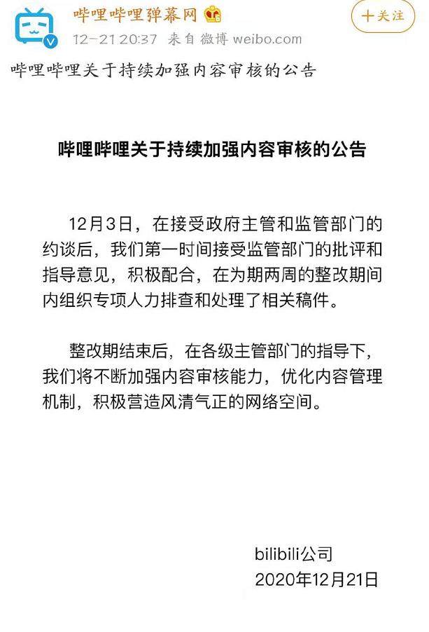 " 我们将不断加强内容审核能力,优化内容管理机制。"12 月 21 日晚间,B 站官方发布公告回应了早间被全国 " 扫黄打非 " 办约谈的事件。