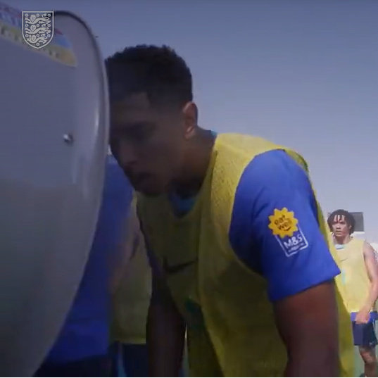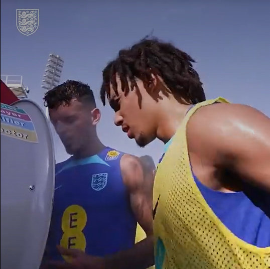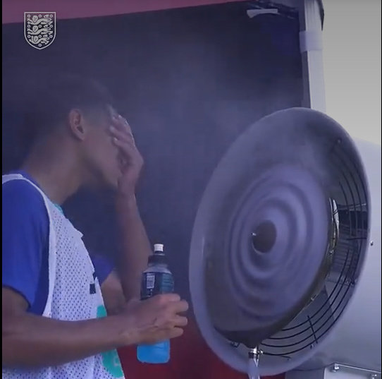 由于卡塔尔当地白天的气温过高,英格兰足球队队员不得不在训练之时使用球场的喷雾设备来降温