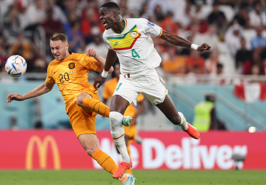 11月21日,荷兰队球员库普梅纳斯(左)与塞内加尔队球员帕佩·西塞在比赛中拼抢。