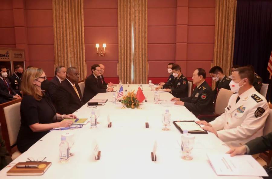 11月22日,正在柬埔寨出席第9届东盟防长扩大会议的国务委员兼国防部长魏凤和应约与美国国防部长奥斯汀举行会谈。