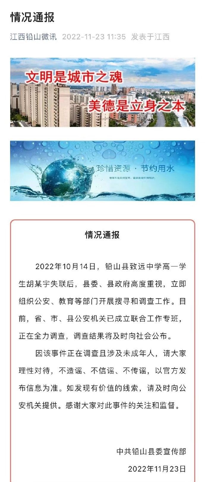 2022年10月14日,铅山县致远中学高一学生胡某宇失联后,县委、县政府高度重视,立即组织公安、教育等部门开展搜寻和调查工作。目前,省、市、县公安机关已成立联合工作专班,正在全力调查,调查结果将及时向社会公布。