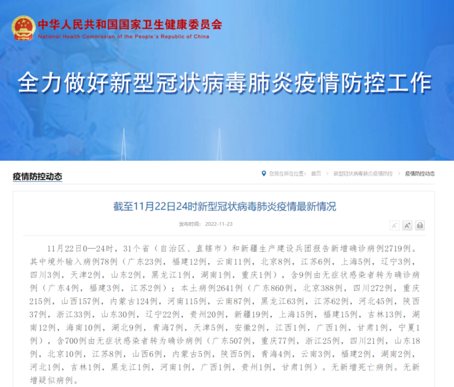 据国家卫健委公布数据,11月22日0—24时,31个省(自治区、直辖市)和新疆生产建设兵团报告新增本土确诊病例2641例,新增本土无症状感染者26242例。健康时报记者根据各地卫健委公布的数据统计,本轮疫情已累计5例死亡病例,多数为80岁以上的老年人。
