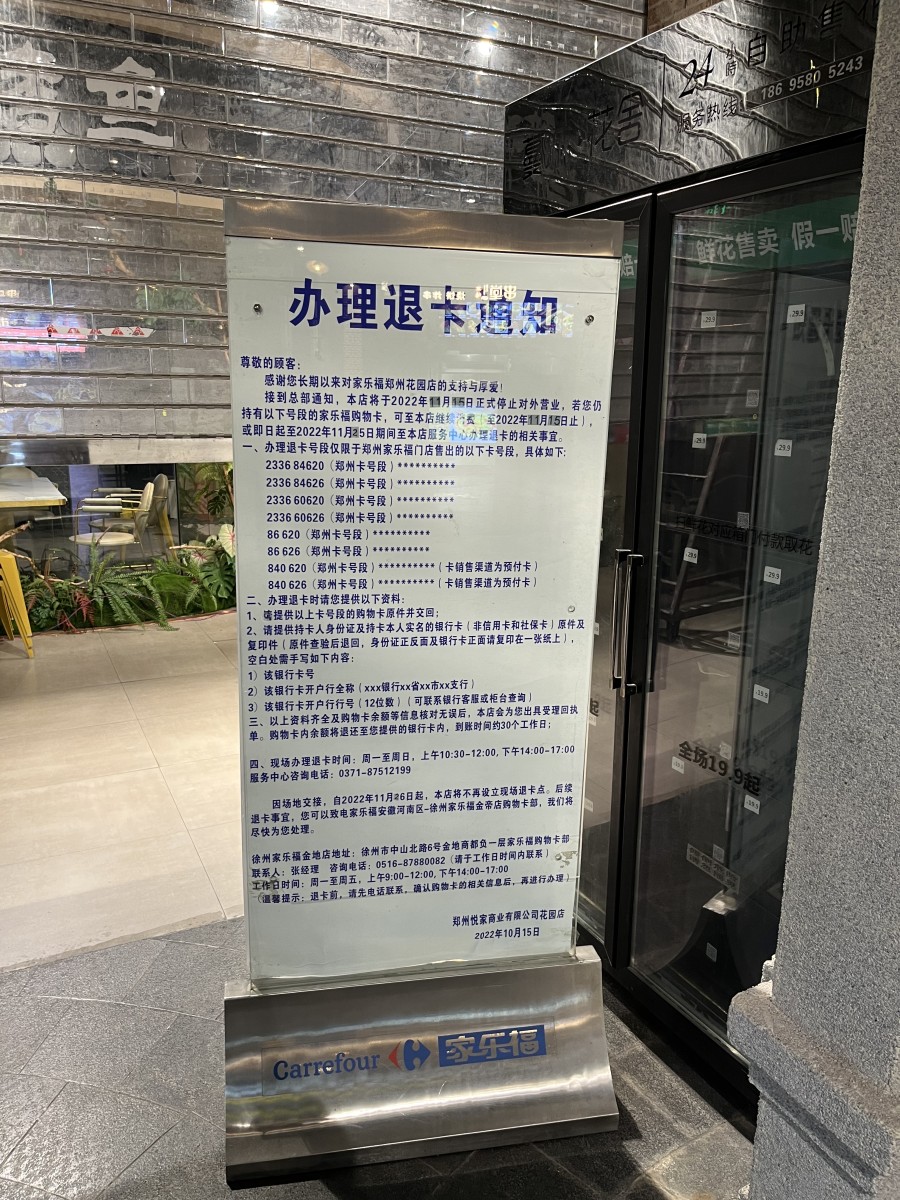 现场负责退卡的工作人员表示,此店从10月份就开始清仓处理了,10月中旬开始停止营业,此后一直处于关闭状态。当问及家乐福在郑州是否还会有新增门店时,工作人员表示暂不清楚后续安排。