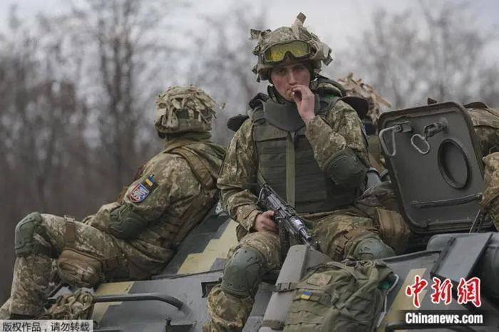 资料图:顿涅茨克地区,乌克兰军人坐在装甲运兵车上。